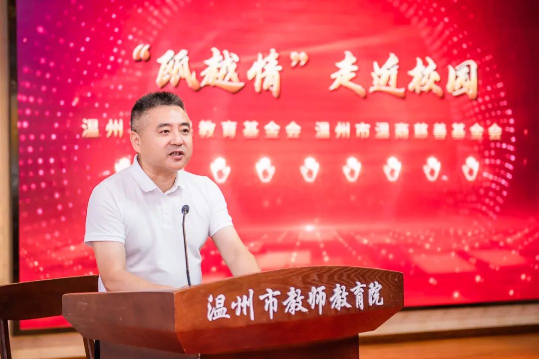 温州市教育局副局长张维凯致词,对温商慈善基金会表示感谢,温商慈善基金会长期支持关心工作教育事业,为温州市教师慈善事业发展倾心付出。他表示,希望通过“瓯越情·走近校园”专项项目推动教师、学校、社会三方的交流,健全学校、家庭、社会育人机制,为教育工作提供更好的服务,为办好人民满意的教育添砖加瓦,为建设高质量教育做出努力!