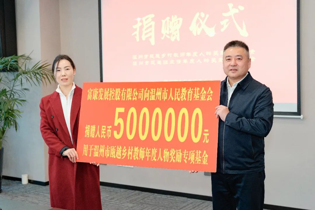 近日,温州市瓯越班主任、乡村教师年度人物奖励专项基金捐赠仪式举行。富康发展控股有限公司李世文、柴娟夫妇和浙江澳林建设有限公司黄长顺、黄东海父子分别向温州市人民教育基金会捐赠500万元,设立“温州市瓯越乡村教师年度人物奖励专项基金”和“温州市瓯越班主任年度人物专项基金”,用于助力我市乡村教师和中小学班主任成长。温州市教育局副局长张维凯出席捐赠仪式。