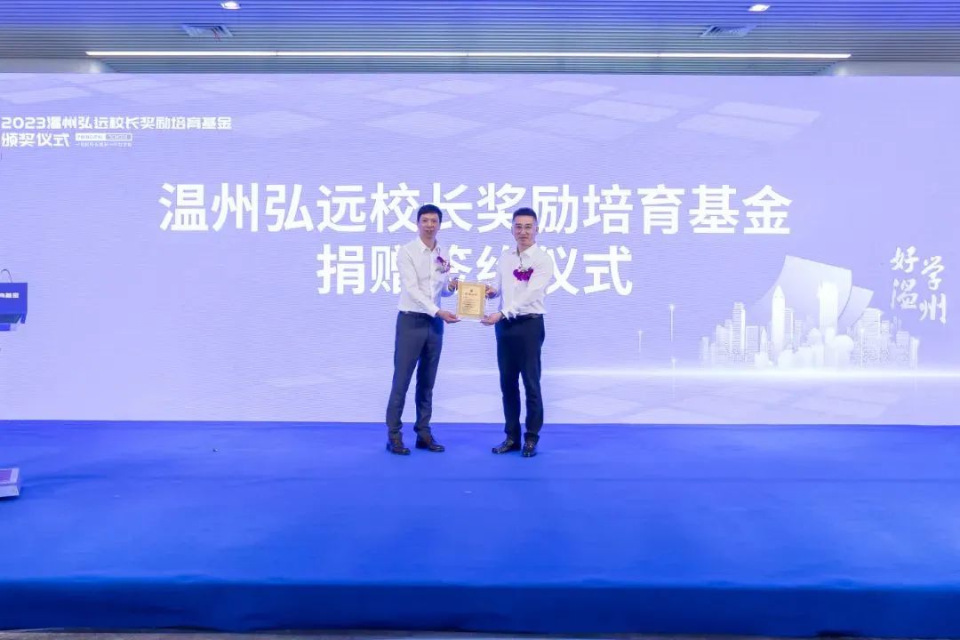 11月6日,在外温商、北京格爵国际服饰有限公司董事长龚祖勉与温州市人民教育基金会签订捐赠协议,成立温州弘远校长奖励培育基金。市教育局党委书记、局长郑焕东,温州大学党委委员、副校长潘玉驹出席捐赠仪式。市教育局副局长张维凯主持。