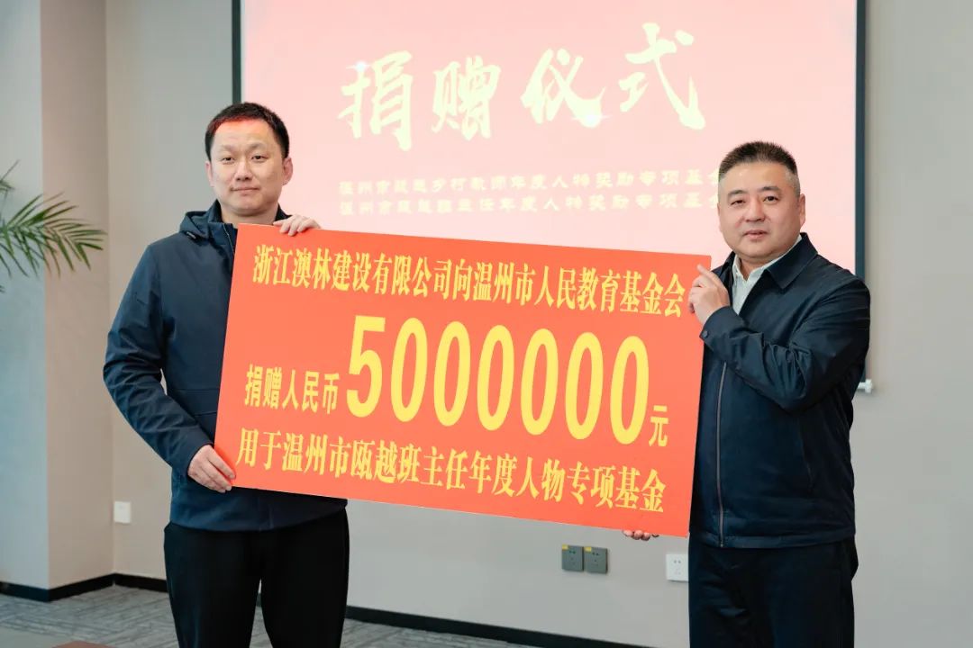 近日,温州市瓯越班主任、乡村教师年度人物奖励专项基金捐赠仪式举行。富康发展控股有限公司李世文、柴娟夫妇和浙江澳林建设有限公司黄长顺、黄东海父子分别向温州市人民教育基金会捐赠500万元,设立“温州市瓯越乡村教师年度人物奖励专项基金”和“温州市瓯越班主任年度人物专项基金”,用于助力我市乡村教师和中小学班主任成长。温州市教育局副局长张维凯出席捐赠仪式。